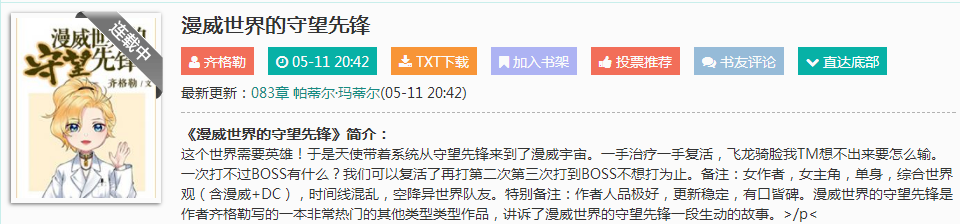 简介:这个世界需要英雄!于是天使带着系统从守望先锋来到了漫威宇宙。一手治疗一手复活,飞龙骑脸我TM想不出来要怎么输。一次打不过BOSS有什么?我们可以复活了再打第二次第三次打到BOSS不想打为止。备注:女作者,女主角,单身,综合世界观(含漫威+DC),时间线混乱,空降异世界队友。特别备注:作者人品极好,更新稳定,有口皆碑。漫威世界的守望先锋是作者齐格勒写的一本非常热门的其他类型类型作品,讲诉了漫威世界的守望先锋一段生动的故事。
