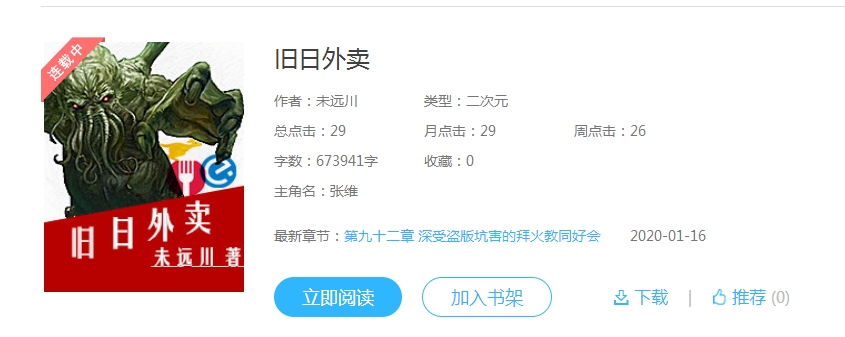 简介:张维经营着一间生意惨淡的奇怪外卖屋。这间名为“旧日外卖”的冷清小店总是隔三差五地接到各种各样的奇怪订单。订单发起者不详,收费不详。但是毫无例外,每次莫名出现的订单,都是前往异世界的送餐任务。来来来,这是你的便当,收好,里面没鸡腿。那边快死的少女,**……啊不,青蛙套餐了解一下。这位兄台,我看你印堂发黑,必是恶鬼缠身,需要订餐驱邪吗?奈亚是合伙人,泡泡是系统,克总吉祥物。宇宙也在暗中痴女蠢蠢欲动。目前进度:《路人女主》(常驻)-《F》(已完结)-《JOJO》(已完结)-《魔禁》(已完结)-SCP(已完结)-明日方舟(进行中)QQ群:766121913,旧日支配者的外卖小屋。旧日外卖是作者未远川写的一本非常热门的二次元类型作品,讲诉了旧日外卖张维一段生动的故事。